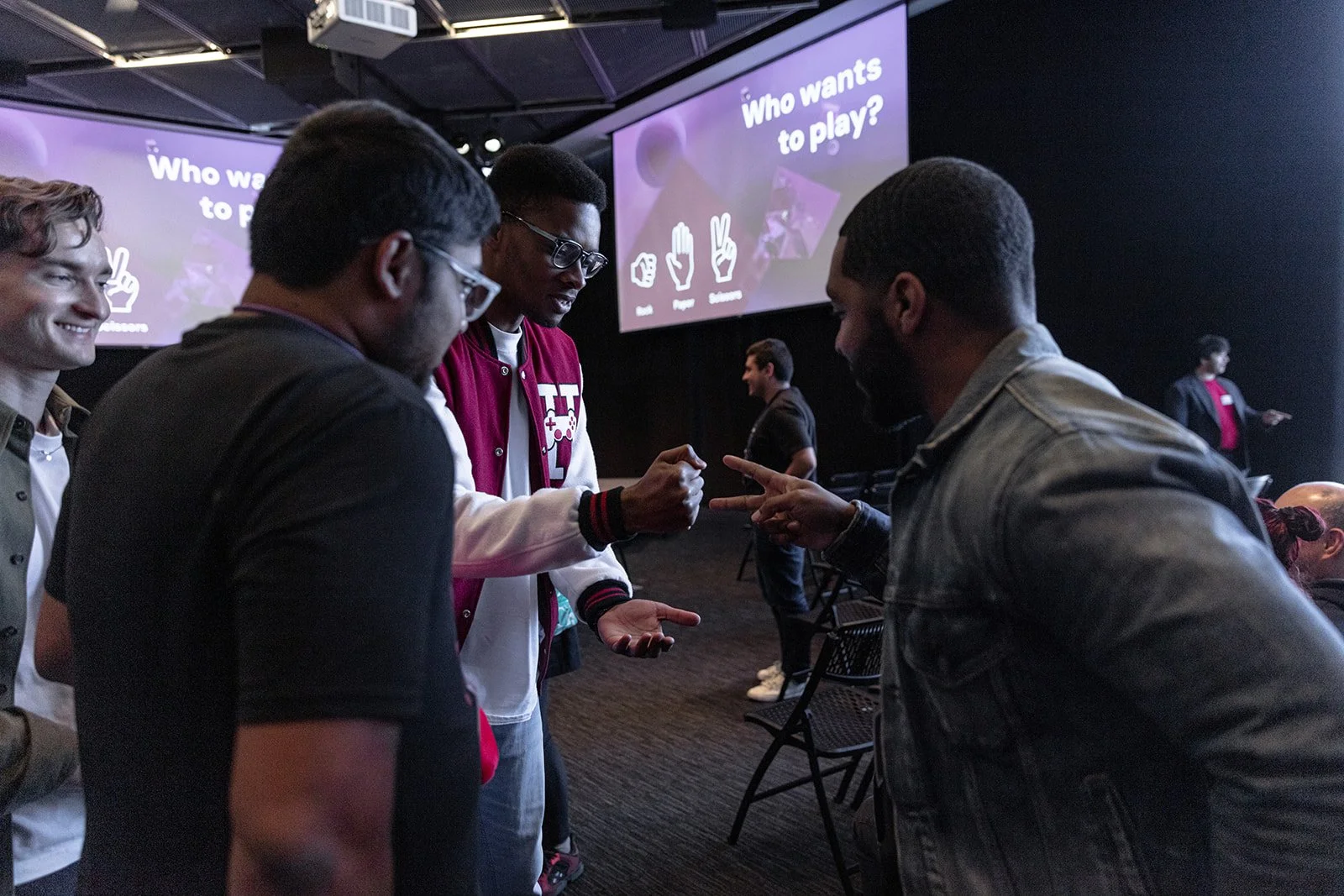 We had a great discussion on the state of game tech and the future of the industry thanks to my outstanding panelists Ryan, Bella, Christopher, and Desiree. Here's a peek at how our panel went (and also a bonus shot of me humbly taking a rock-paper-scissors L to Wabantu).